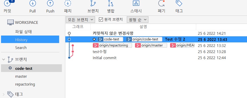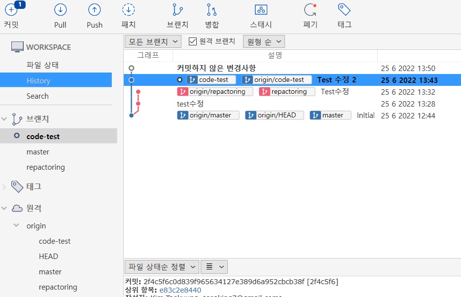 충돌이 없이 병합이 되었다. origin/code-test도 push로 반영하고, master로 돌아가서 병합을 반영하면 된다.