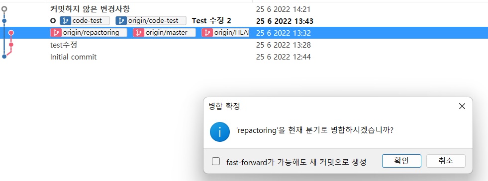 master브랜치로 이동 후 repectoring 브랜치로 병합하기를 누른다.