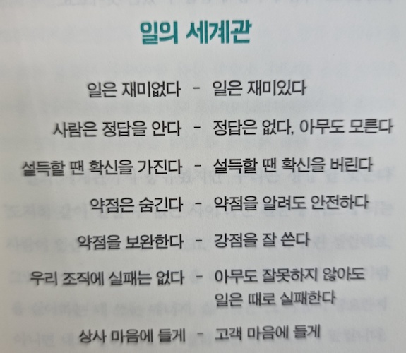직장에서 사람들끼리 의견합의가 잘 안되고, 충분히 이야기했는데도 뭔가 안돌아가는 경우는 일에 대한 세계관의 문제일 수 있다. 어떤 사람에게 일은 내 생존을 위해서, 재미없지만 어쩔 수 없이 하는 것일 수 있고, 누군가는 자신의 성취, 성장을 위해서 할 수도 있다.
