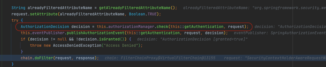 - AuthorizationFilter에서 AuthorizationManager(주로 AuthorityAuthorizationManager)에 의해 체크됨